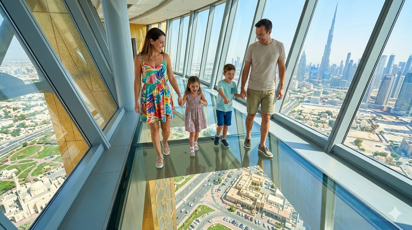 Kids go absolutely wild over the glass floor at the top walkway – walking across it while staring down at the bustling city below is an experience that's not for the faint of heart, but it's completely unforgettable. Inside, there's an interactive museum that tells the story of Dubai's journey from a small fishing village to a global tourism hub. The exhibit is cleverly designed: the timeline is presented through multimedia rather than boring placards, so even school-age kids stay genuinely engaged.